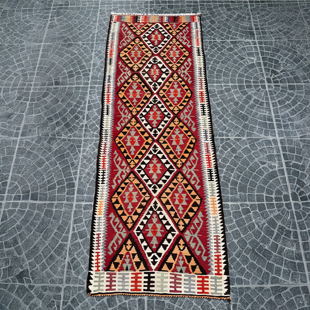 Vintage Handwoven Kilim from Denizli Comb Motif 3.44×9.38ft